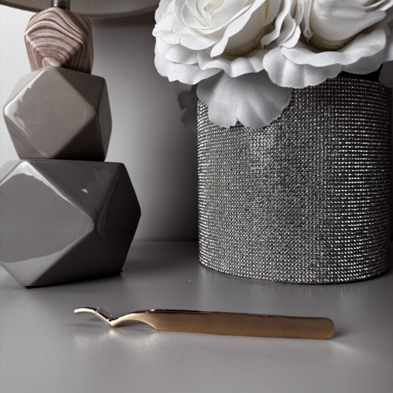 Metalowa, złota pęseta służąca do aplikacji oraz zaciskania kępek bondingowych.