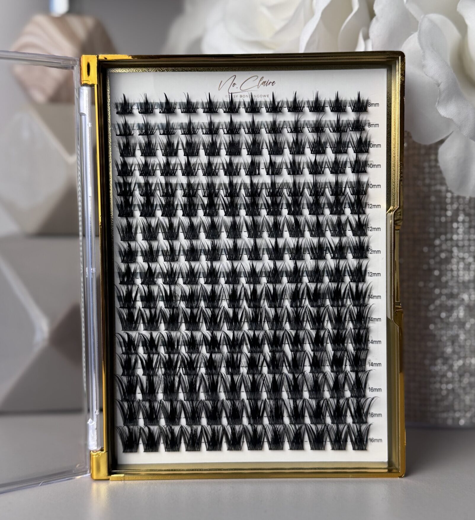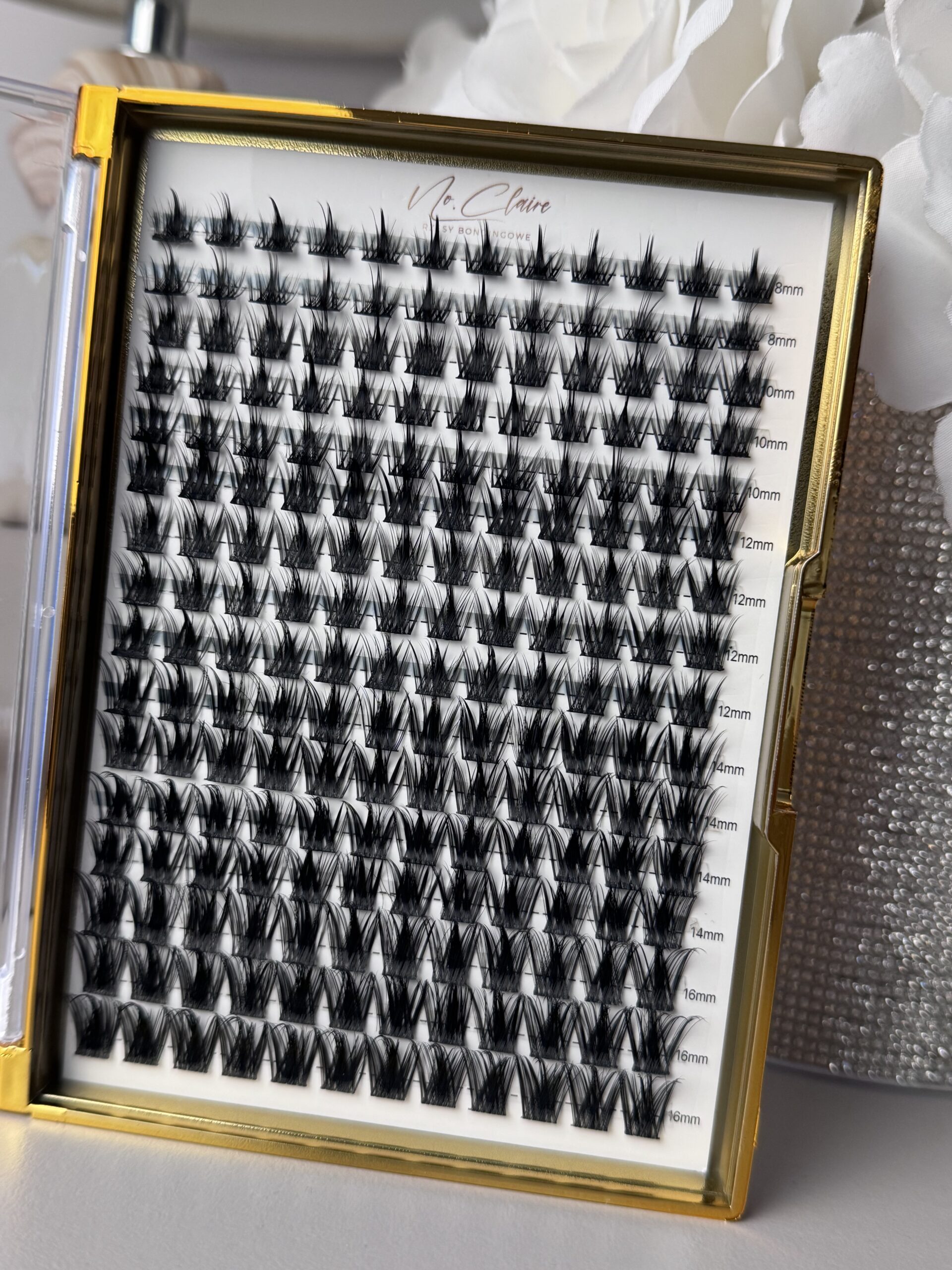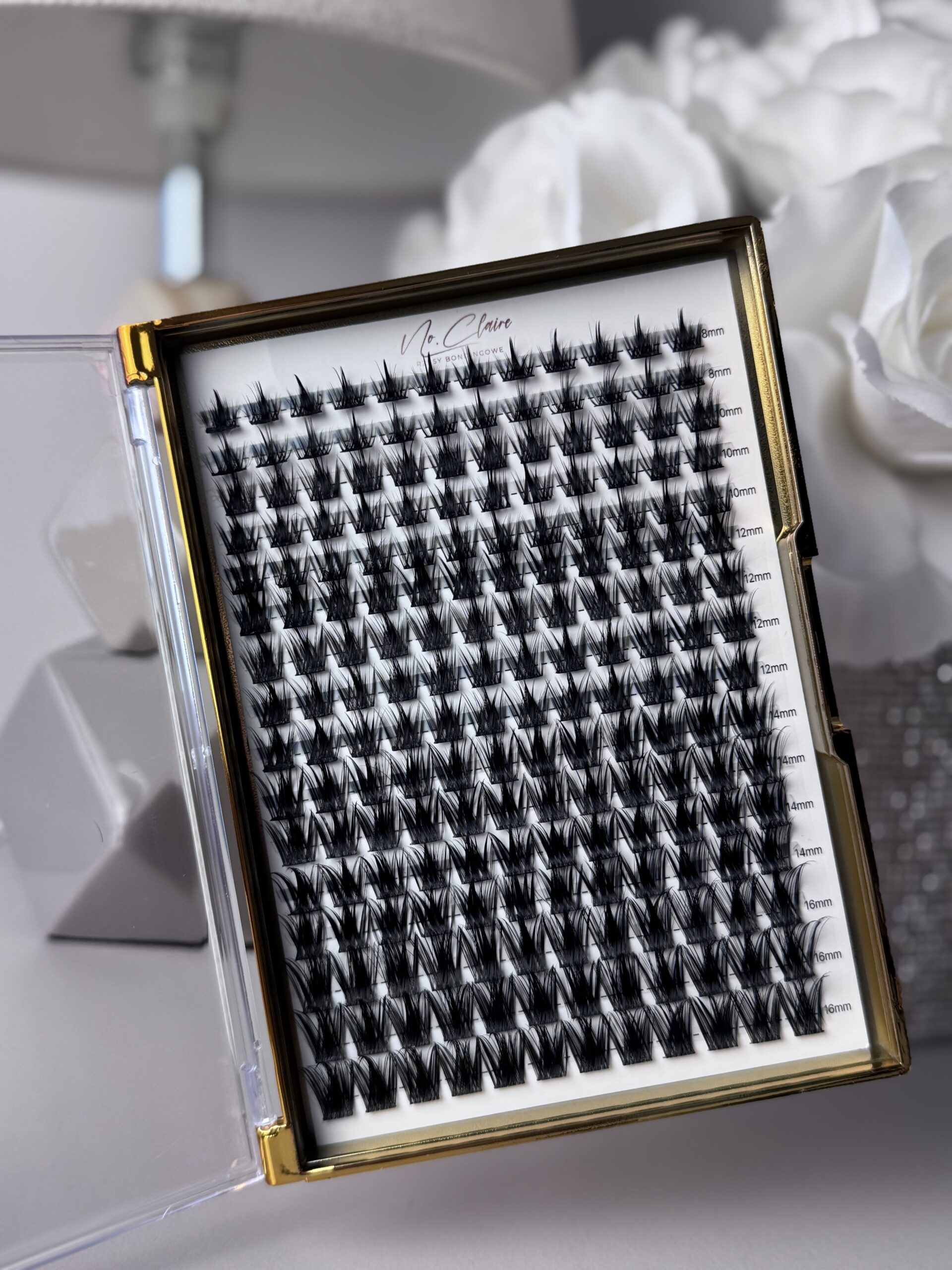 Kasetka kępek rzęs do samodzielnego użytku w domu posiada, 16 rzędów z 12 kępkami rzęs o rożnych długościach.