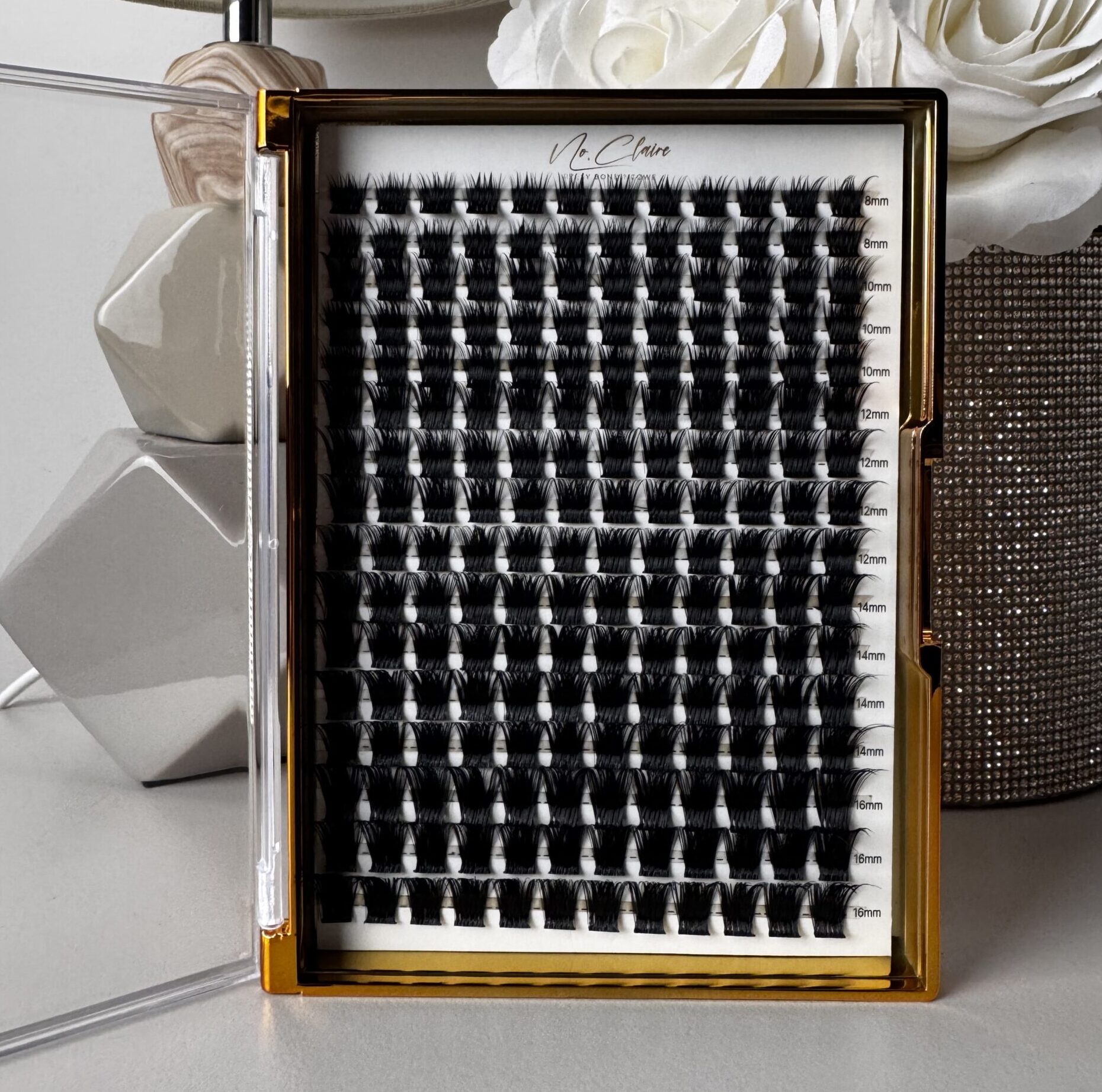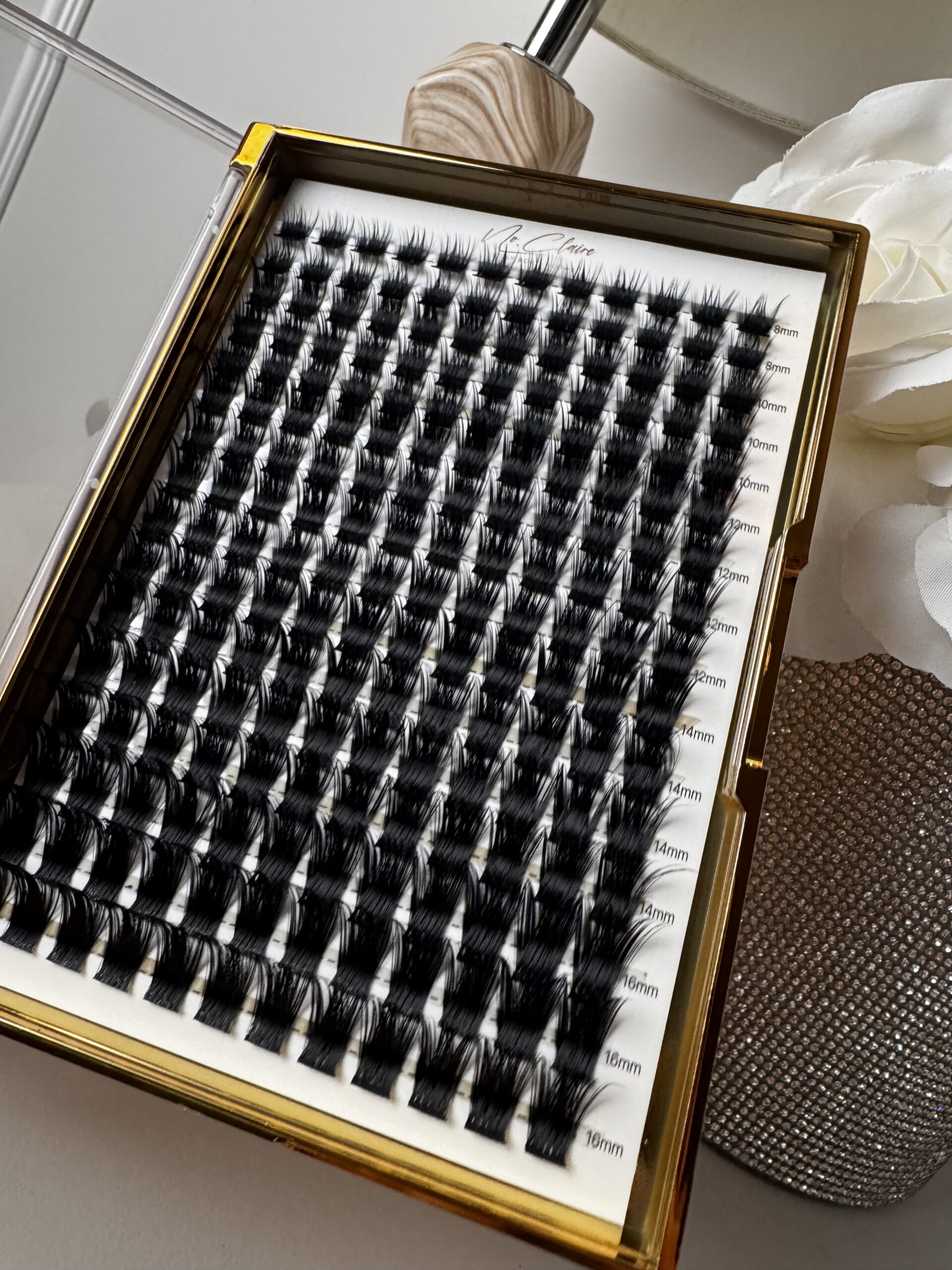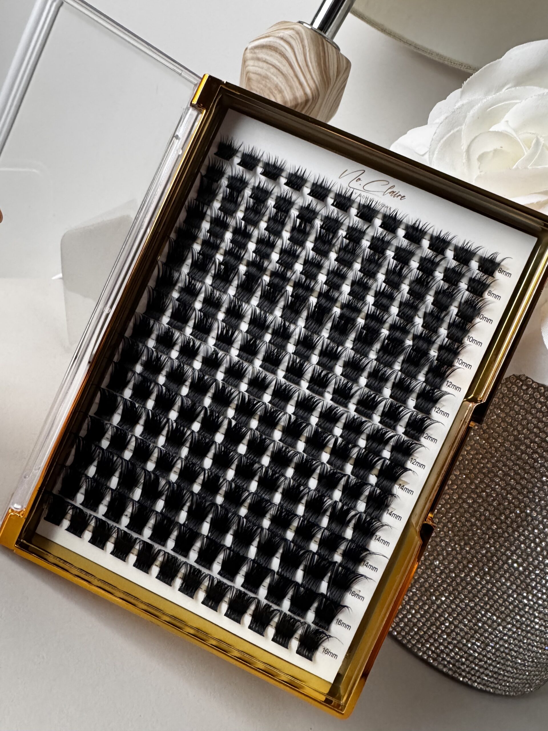 Kasetka kępek rzęs do samodzielnego użytku w domu posiada, 16 rzędów z 12 kępkami rzęs o rożnych długościach.